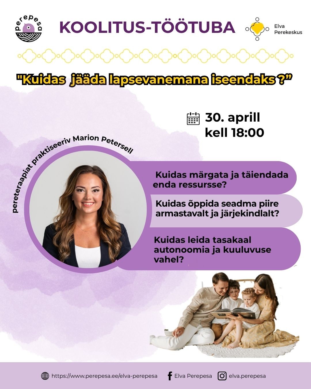 Kutsume Sind neljapäeval, 30. aprillil, kell 18:00 Elva Perepesasse (Järve 1-1) osa saama koolitus-töötoast "Kuidas jääda lapsevanemana iseendaks?".