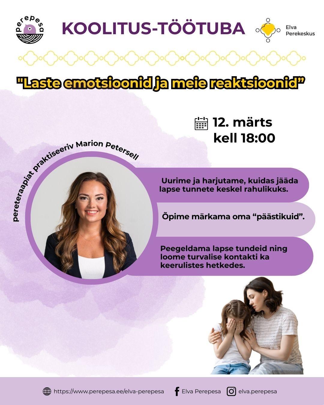 Kutsume Sind neljapäeval, 12. märts, kell 18:00 Elva Perepesasse osa saama koolitus-töötoast "Laste emotsioonid ja meie reaktsioonid".