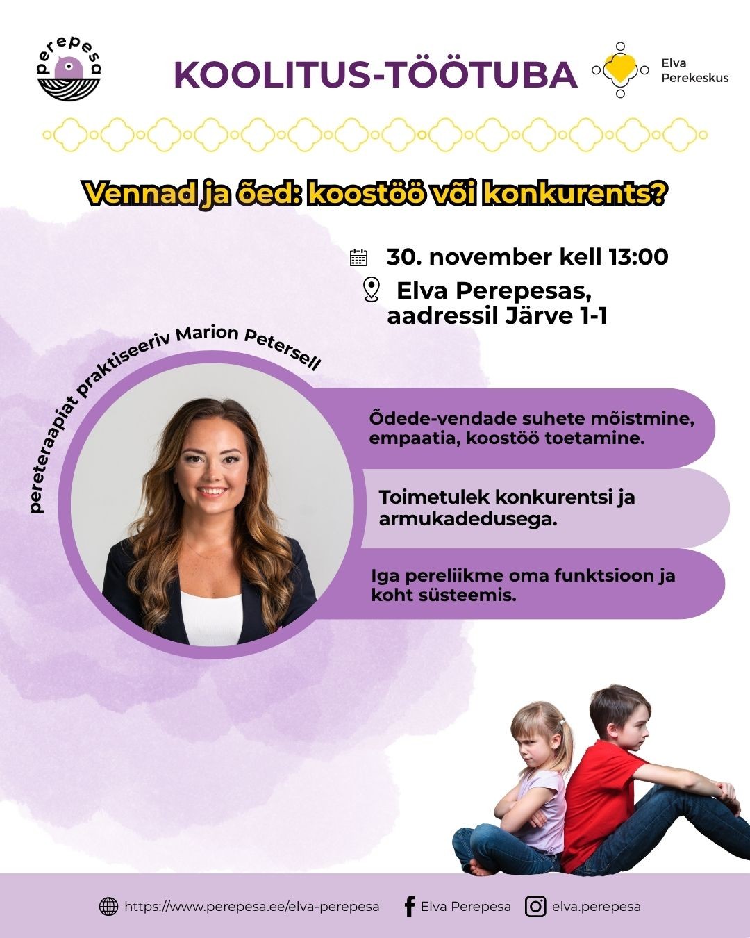 Kutsume Sind pühapäeval, 30. novembril, kell 13:00-15:00 Elva Perepesasse (uuel aadressil, Järve 1-1) osa saama koolitus-töötoast "Vennad ja õed: koostöö või konkurents?".