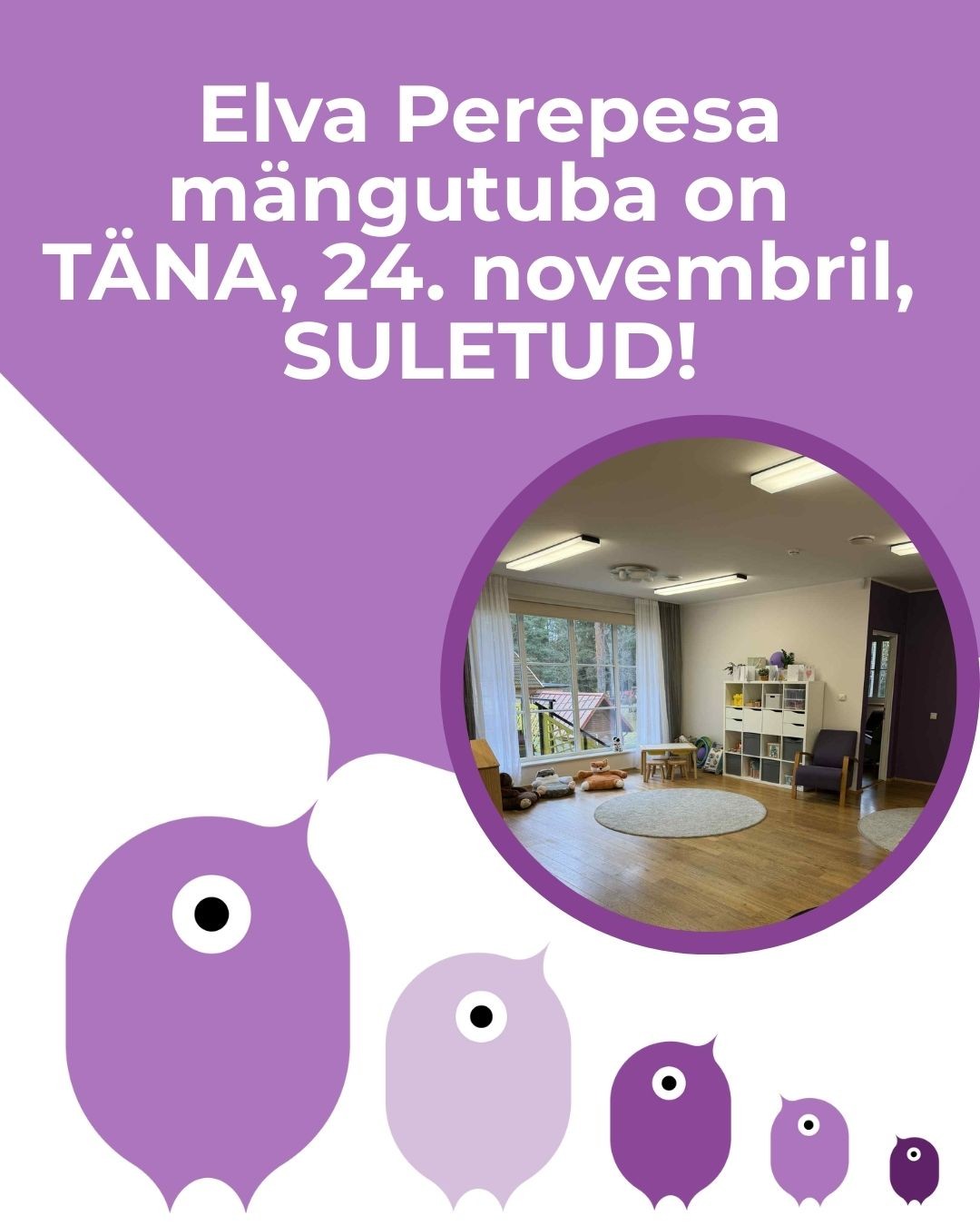 24. novembril on mängutuba SULETUD! 24.11.2025 Töötaja haigestumise tõttu on 24. novembril mängutuba suletud!