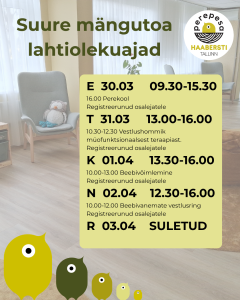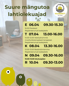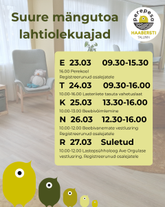 Lahtiolekuajad 06.04-10.04 Vestlushommik "Lasteaiaga kohanemine" Haabersti Perepesa lahtiolekuajad 30.03-03.04 Lasteriiete tasuta vahetuslaat Lahtiolekuajad 23-27.03 Lastekirjanduse pärastlõuna Haabersti perepesa lahtiolekuajad 16.03-20.03 SULETUD - Tallinna Perepesade meeskonnapäev Tagasi 2 / 10 lehest (kokku 78 uudist) Edasi