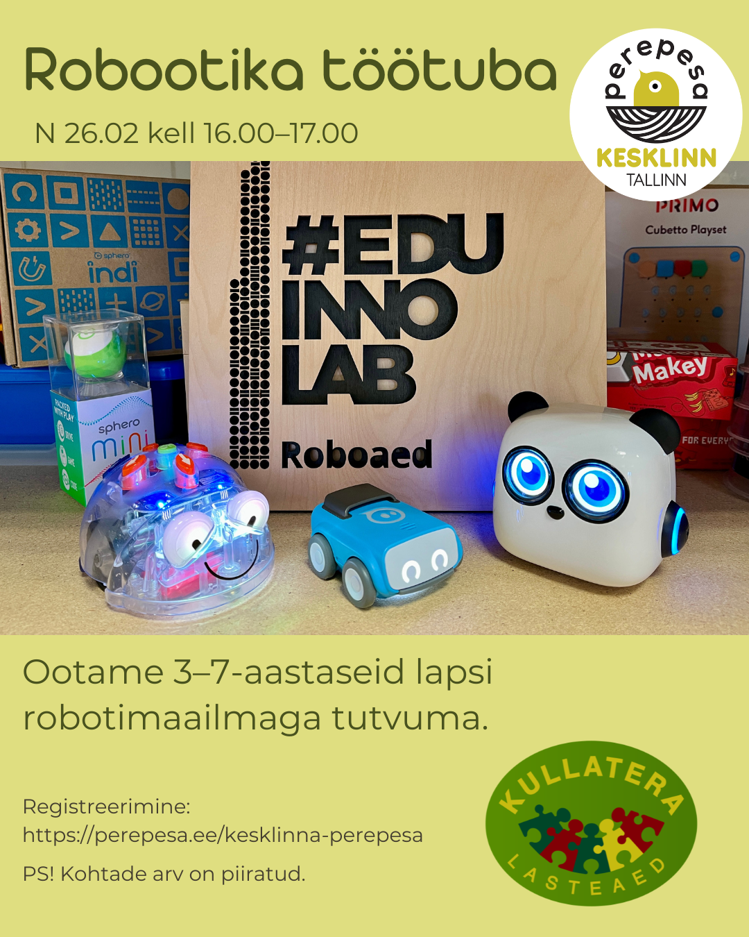 Rõõmuga kutsume 26. veebruaril kell 16.00–17.00 3–7-aastaseid lapsi Kesklinna Perepessa robootika töötuppa.