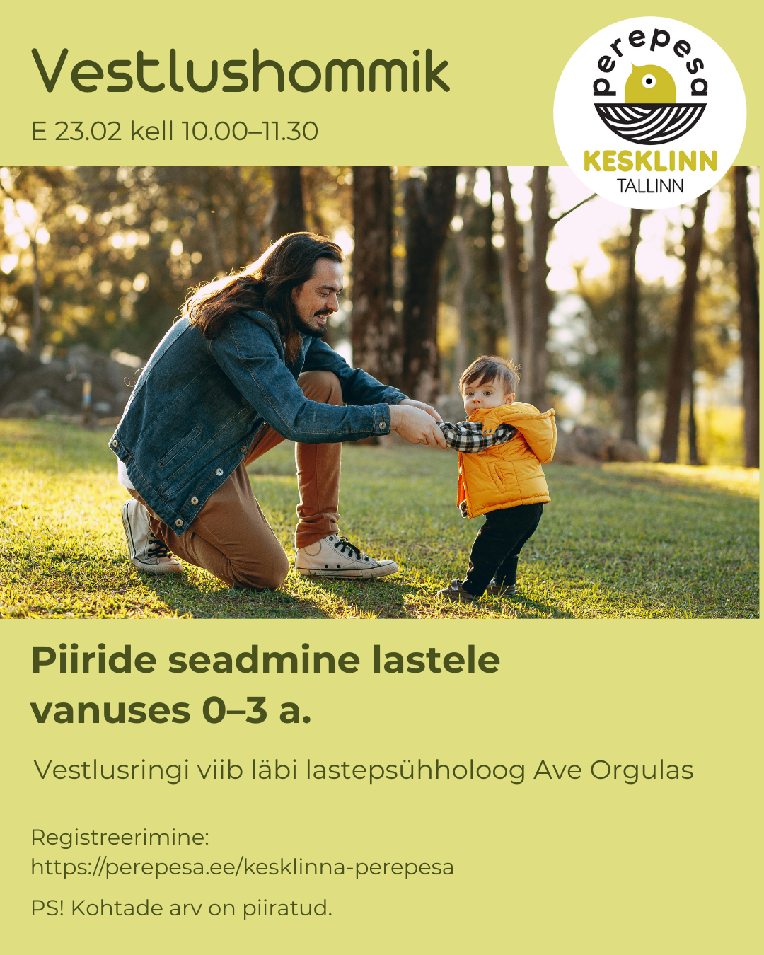 Kutsume teid vestlushommikule 23. veebruaril kell 10.00–11.30, kus arutame, kuidas lapsele piire seades ise rahulikuks jääda. Kohvihommikut viib läbi lastepsühholoog Ave Orgulas.