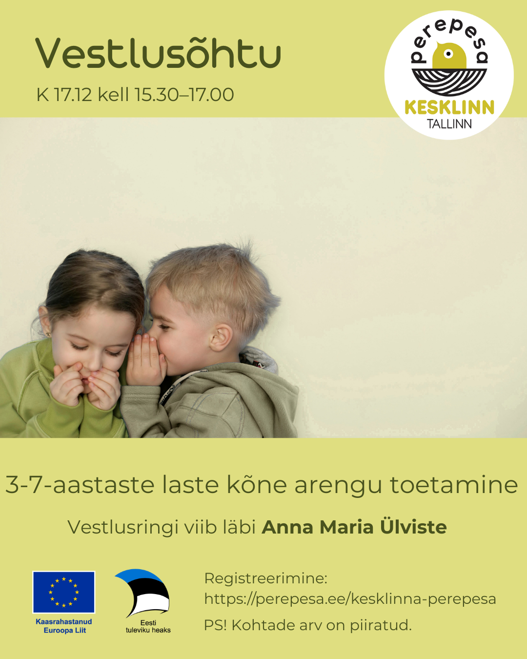 Seekordsel vestlusõhtul keskendume teemale „3–7-aastaste laste kõne arengu toetamine“. Räägime, millised oskused selles vanuses kujunevad, kuidas märgata võimalikke takistusi ning milliseid praktilisi võtteid saab lapsevanem igapäevaselt kasutada, et oma lapse kõne arengut toetada.