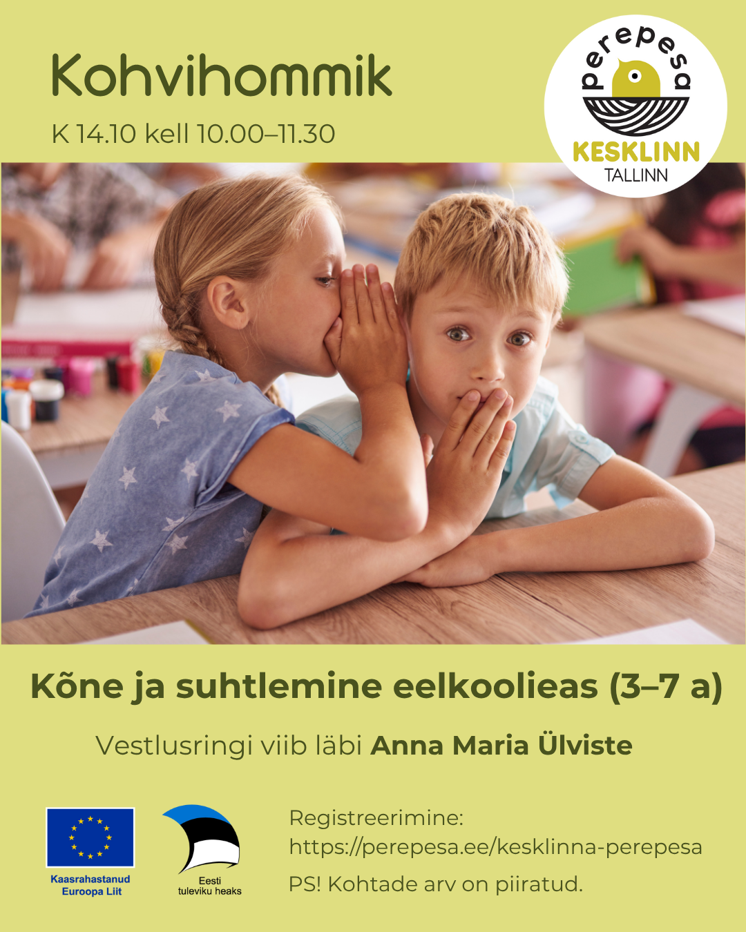 Kohvihommik toimub suures mängutoas, kus lapsed võivad loengu ajal vabalt mängida. See annab lapsevanemale võimaluse kuulata ja osaleda, samal ajal kui laps tunneb end turvalises ja mängulises keskkonnas hästi. Oled oodatud osalema nii koos lapsega kui ka üksi.