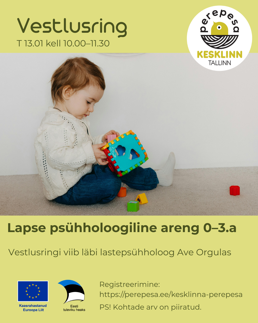 Ootame teid 13. jaanuaril kell 10.00–11.30 Kesklinna Perepessa vestlushommikule, mille seekordne teema on „Lapse psühholoogiline areng vanuses 0-3 aastat“.