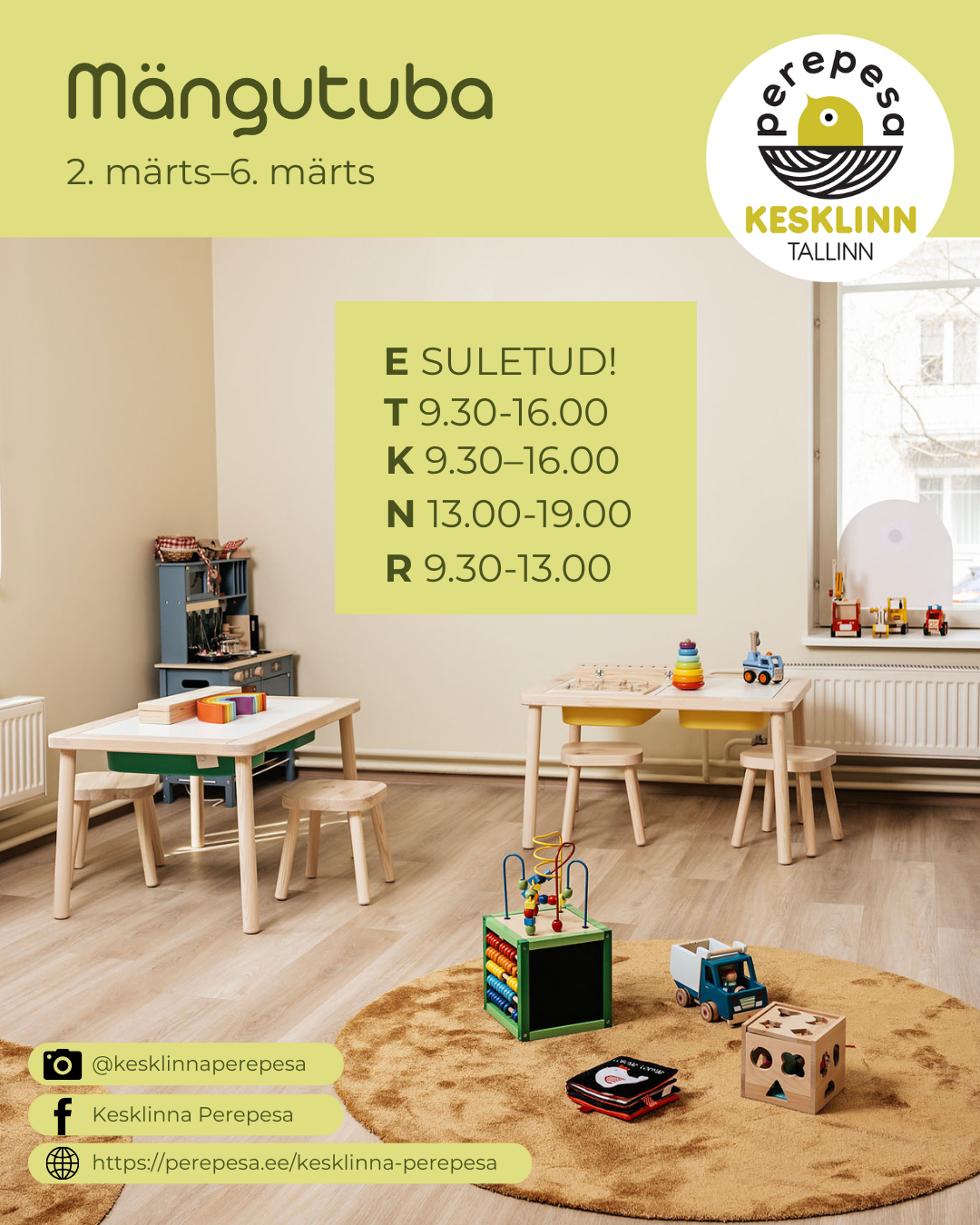 Järgmisel nädalal ootame teid mängutuppa teisipäevast kolmapäevani kell 9.30-16.00, neljapäeval kell 13.00-19.00 ja reedel kell 9.30-13.00.