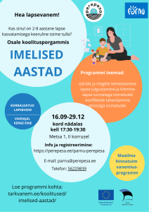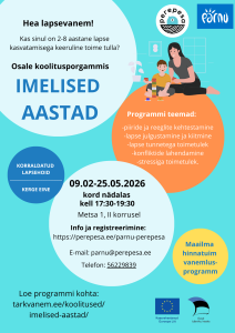 Lastevanemate vestlusringid ja koolitused Avatud mängutuba Psühholoogiline nõustamine Juhendatud tegevused Vanemlusprogramm 'Imelised aastad' Pereteraapia Gordoni suhtlustreening lapsevanematele Beebivanemate vestlusringid