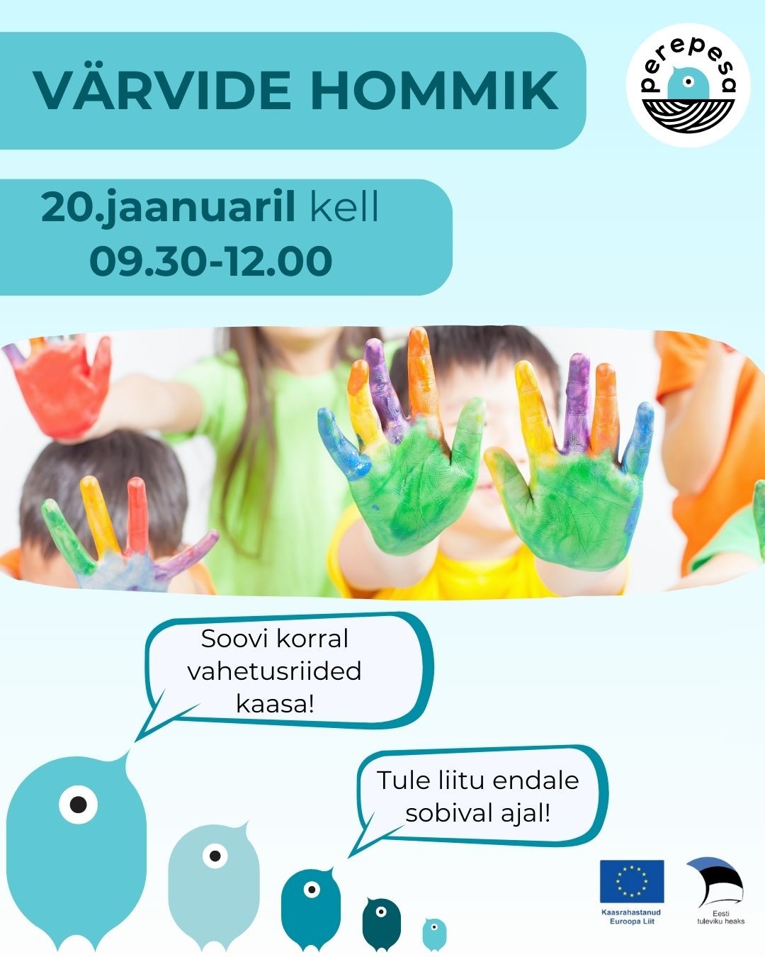 NB! Tegemist on värvidega – soovitame kaasa võtta vahetusriided või põll, et loovust saaks nautida muretult ja rõõmuga!