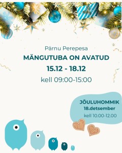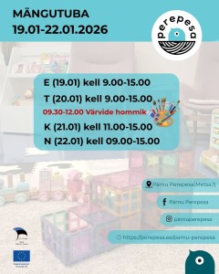 Värvide hommik Mängutuba 19.01-22.01 Kohtume taas 5.jaanuaril Jõuluhommik Mängutuba 15.12-18.12 Veebikoolitus " Digiseadmete mõju väikelastele" Küünlalaterna töötuba Mängutuba 17.11-20.11 1 / 4 lehest (kokku 29 uudist) Edasi