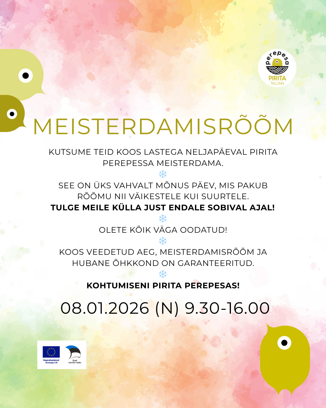 Pirita Perepesa mängutoa juhendaja ootab suuremaid ja väiksemaid lapsi koos vanematega meisterdamispäevale!