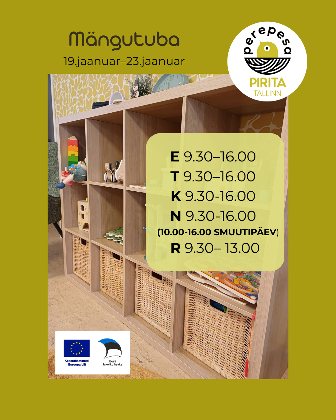 Järgmisel nädalal ootame teid mängutuppa esmaspäevast neljapäevani kell 9.30-16.00 ja reedel kell 9.30-13.00.