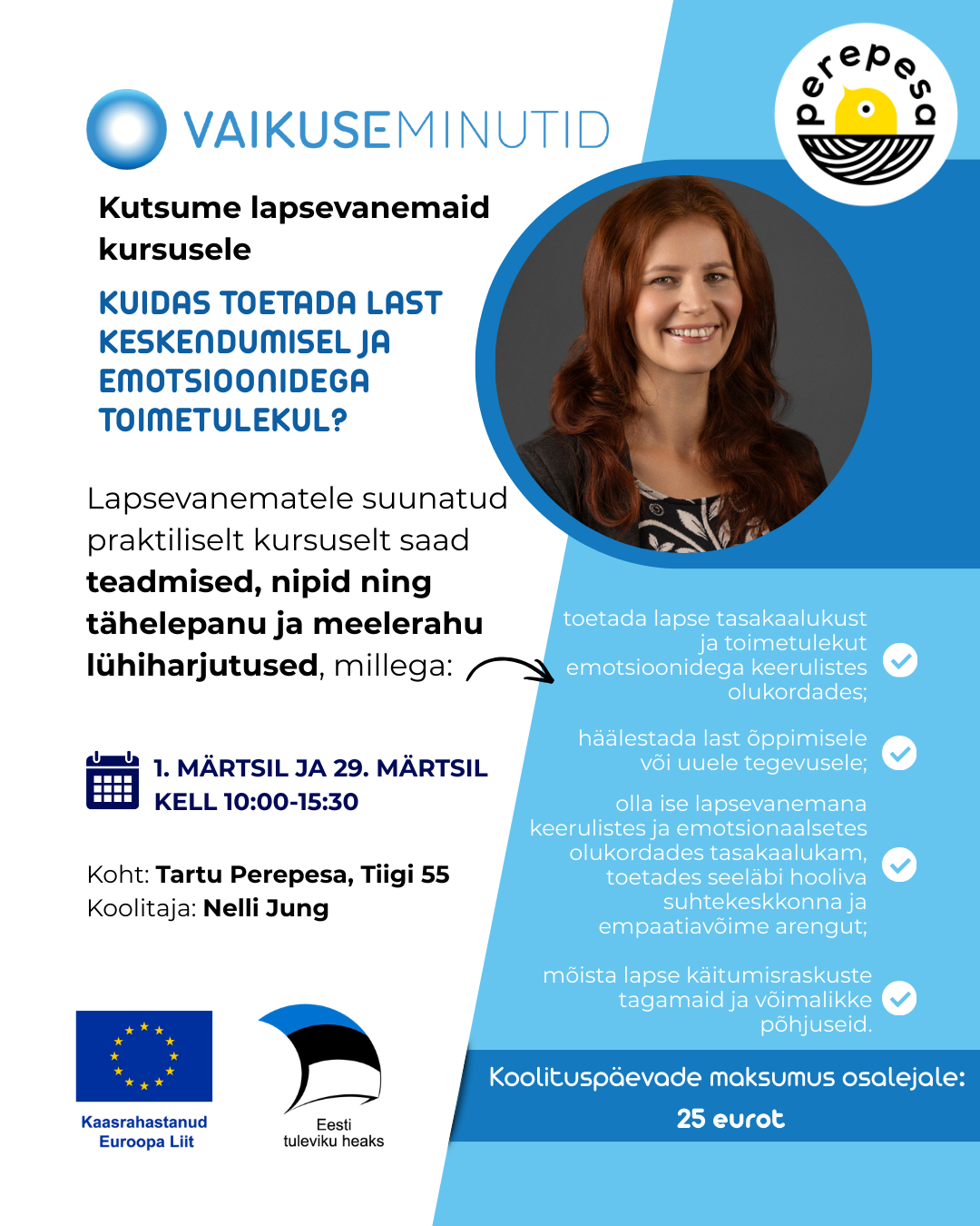 Lapsevanematele suunatud praktiliselt kursuselt saad teadmised, nipid ning tähelepanu ja meelerahu lühiharjutused, millega: