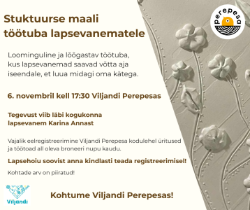 Struktuurse maali töötuba Värvidega mäng Lapsevanemate vestlusring "Lapsevanema uks iseendasse – suhete mustrid" Koolitus "Väikelaste emotsioonidega toimetulek" Leiva küpsetamine Viljandi haigla ja Perepesa lõid käed ühiste perekooli loengute korraldamiseks Kidsmile podcast Läbus snäkk 1 / 21 lehest (kokku 165 uudist) Edasi