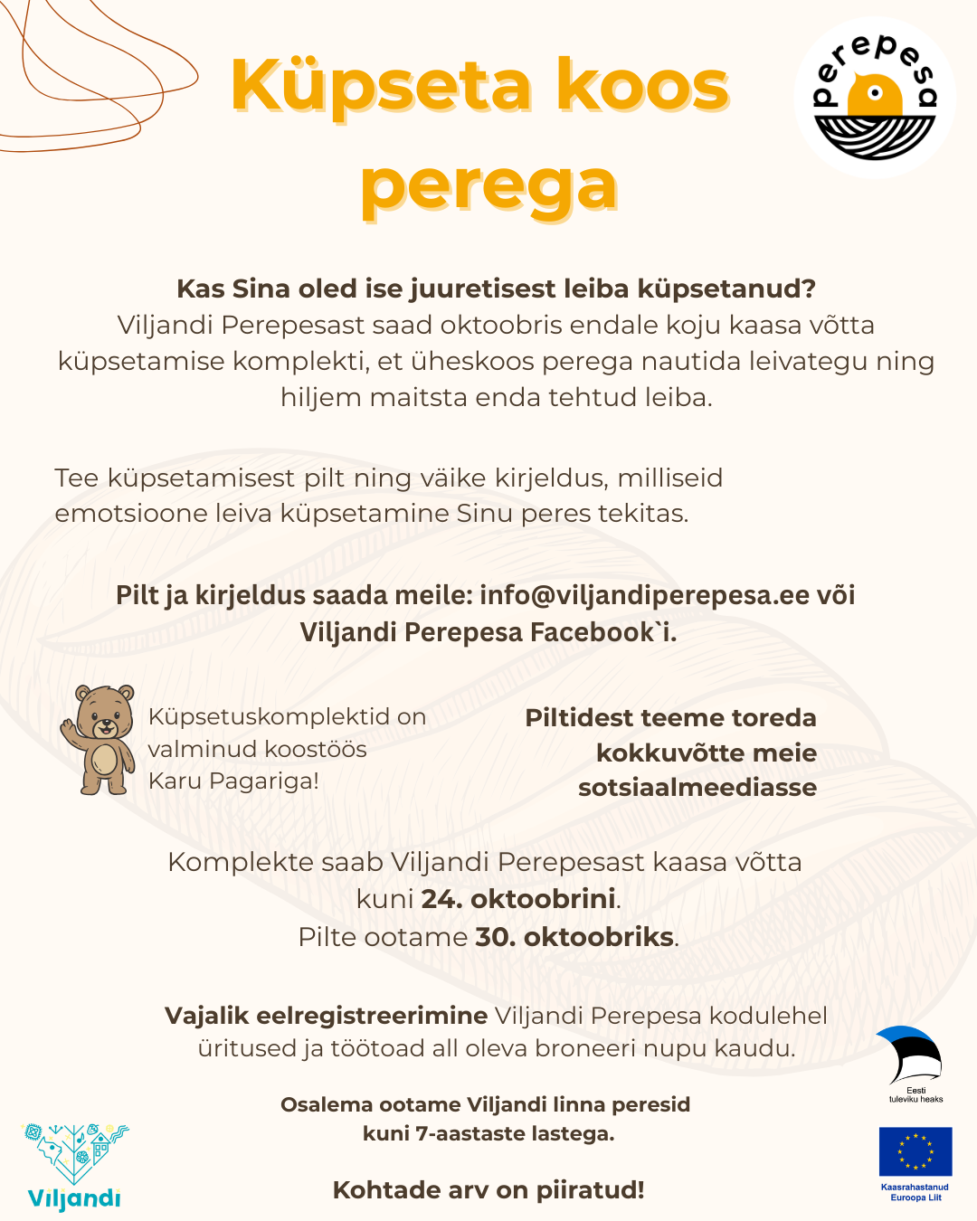 Küpsetamise käigus jäädvusta koos perega tore pilt ning pange kirja, milliseid tundeid leivategu Sinu peres tekitas. Saada need meile info@viljandiperepesa.ee või Viljandi Perepesa Facebook´i hiljemalt 30. oktoobriks.