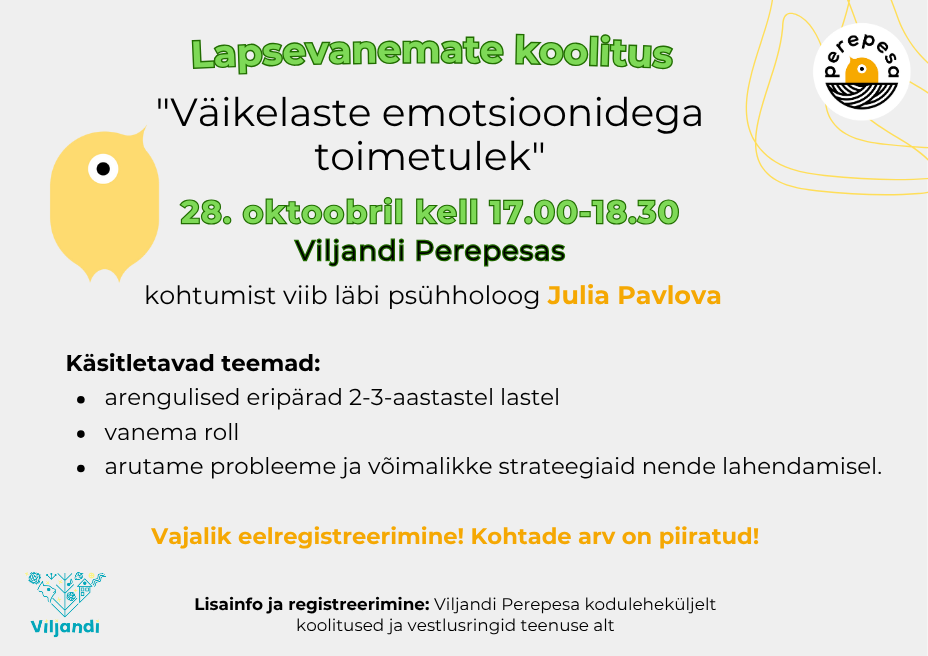 Neljapäeval, 28. oktoobril kell 17.00-18.30 toimub Viljandi Perepesas koolitus "Väikelaste emotsioonidega toimetulek".