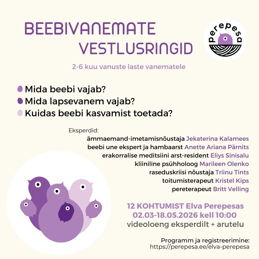 Kohtumised toimuvad esmaspäeviti kell 10:00-11:00 (02.03-18.05.2026) Elva Perepesa ruumides (Järve tänav 1-1).