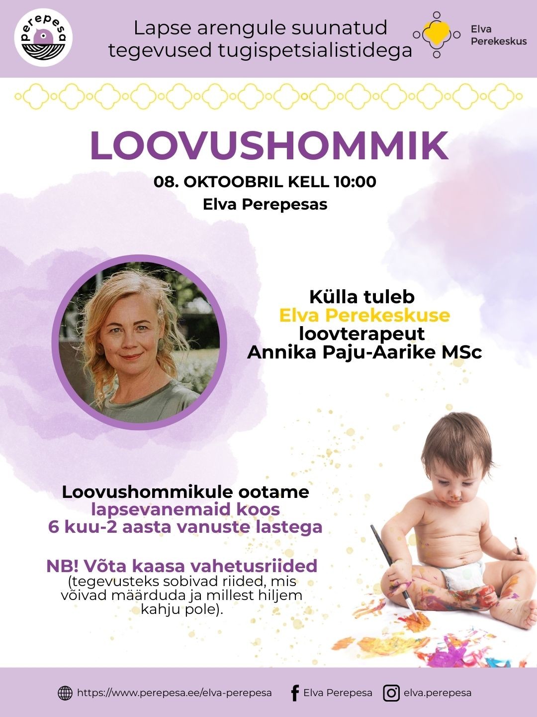 Kohtumist juhendab Elva Perekeskuse kunstiterapeut Annika Paju-Aarike MSc , kes toetab lapse arengut loovate tegevuste kaudu.