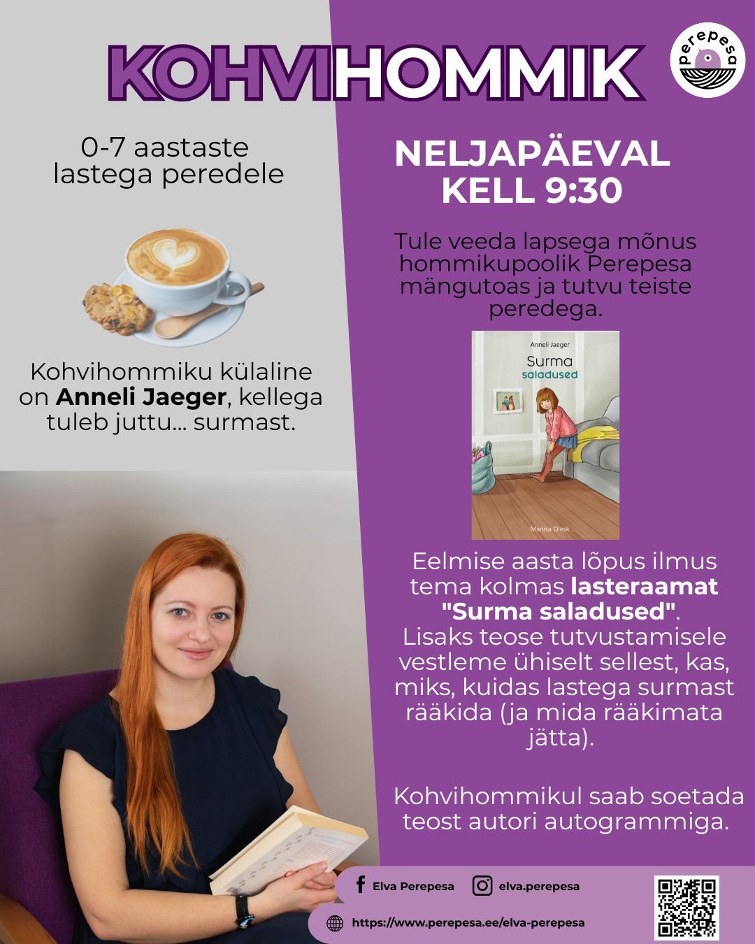 Eelmise aasta lõpus ilmus tema kolmas lasteraamat "Surma saladused". Lisaks teose tutvustamisele vestleme ühiselt sellest, kas, miks, kuidas lastega surmast rääkida (ja mida rääkimata jätta). Kohvihommikul saab soetada teost autori autogrammiga.