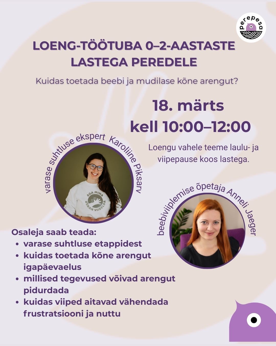 Loengu osas jagab teadmisi ja praktilisi soovitusi varase suhtluse ekspert ning Eesti beebiviiplemise programmi looja Karoliine Piksarv. Kohtumise sisse mahuvad ka väikesed laulu- ja viipepausid, mida viib läbi Elva beebiviiplemise õpetaja Anneli Jaeger.