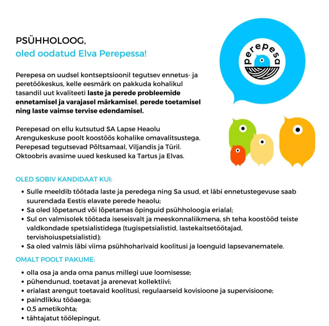 Kui tunned, et Perepesa psühholoogi ametikoht on just Sinu jaoks, siis anna oma huvist