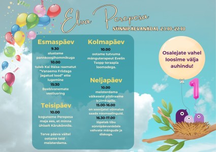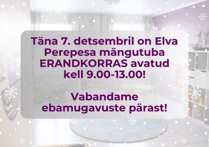 Soovime teile imelist pühadeaega, meeldejäävaid hetki pere ja lähedaste seltsis, ning et kõik teie soovid täituksid! 7. detsembril oleme ERANDKORRAS avatud kell 9.00-13.00! 15.11.2023 Perepesa mängutuba SULETUD! Sünnipäevanädal Elva Perepesa mängutuba on 27.09.2023 SULETUD! Juhendatud tegevuste hommikud Elva Perepesa otsib asenduskohale mängutoa juhendaja-koordinaatorit Mängutoa lahtiolekuajad juunis Tagasi 4 / 5 lehest (kokku 38 uudist) Edasi
