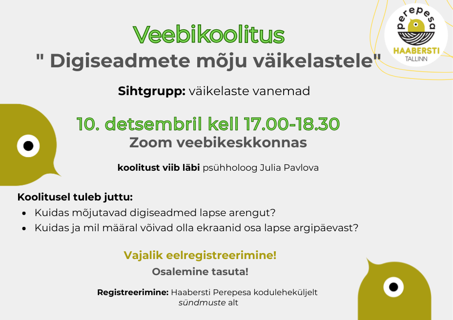 Kolmapäeval, 10. detsembril kell 17.00-18.30 toimub Zoom keskkonnas veebikoolitus teemal "Digiseadmete mõju väikelastele".