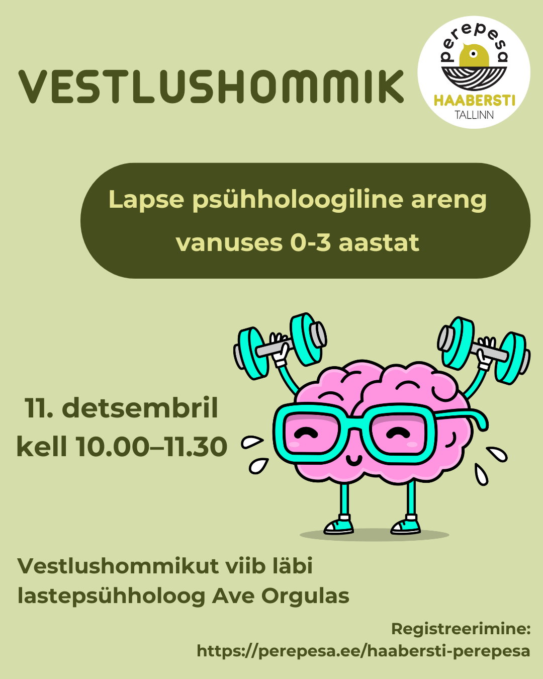Ootame teid 11. detsembril kell 10.00–11.30 Haabersti Perepessa vestlusringi, mille seekordne teema on „Lapse psühholoogiline areng vanuses 0-3 aastat“. Vestlusringi viib läbi laste psühholoog Ave Orgulas.