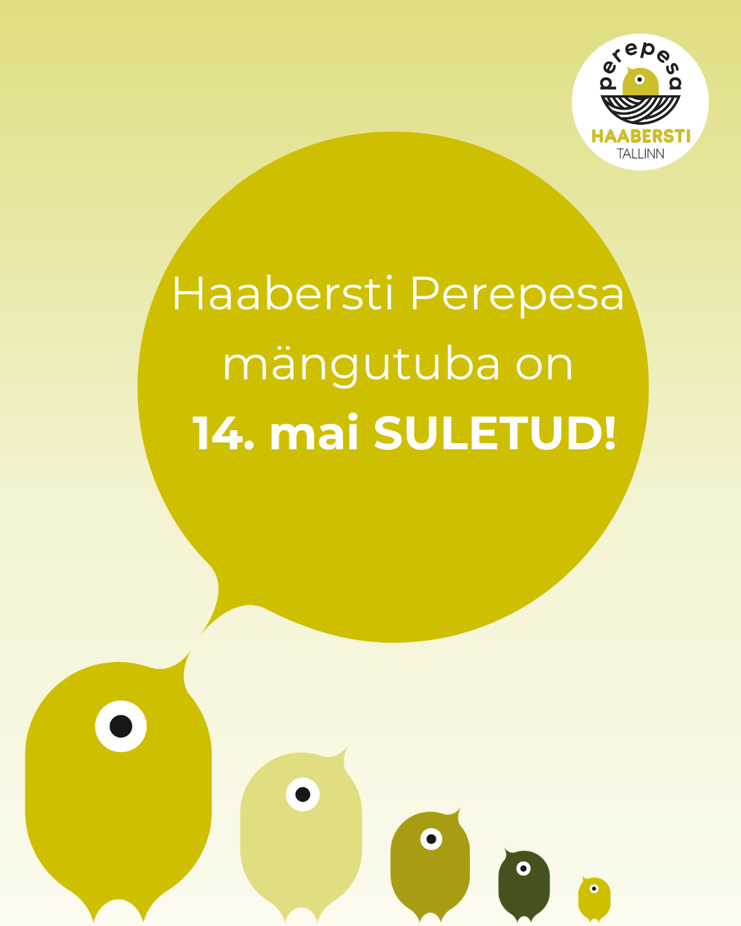 Tuletame meelde, et kolmapäeval 14. mail on Haabersti Perepesa mängutuba SULETUD.