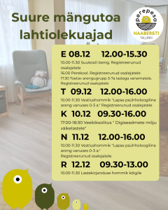 Lahtiolekuajad Lahtiolekuajad Lahtiolekuajad Lastekirjanduse hommik Vestlushommik „Lapse psühholoogiline areng vanuses 0-3 aastat“ Veebikoolitus " Digiseadmete mõju väikelastele" Vestlushommik „Lapse psühholoogiline areng vanuses 0-3 aastat“ LAHTIOLEKUAJAD Tagasi 2 / 8 lehest (kokku 62 uudist) Edasi
