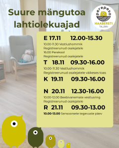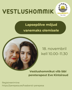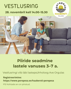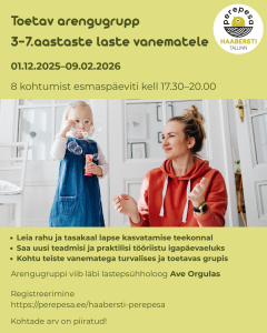 Toetav arengugrupp 3-7a lastega vanematele "Mina lapsevanemana" Vestlusring "Piiride seadmine lastele vanuses 3-7 a." LAHTIOLEKUAJAD 01.12-05.12 LAHTIOLEKUAJAD 24-28.11 Vestlushommik "Lapsepõlve mõjud vanemaks olemisele" Lahtiolekuajad 17.11-21.11 Lahtiolekuajad 10.11-14.11 Lahtiolekuajad 03.11-07.11 Tagasi 3 / 8 lehest (kokku 62 uudist) Edasi