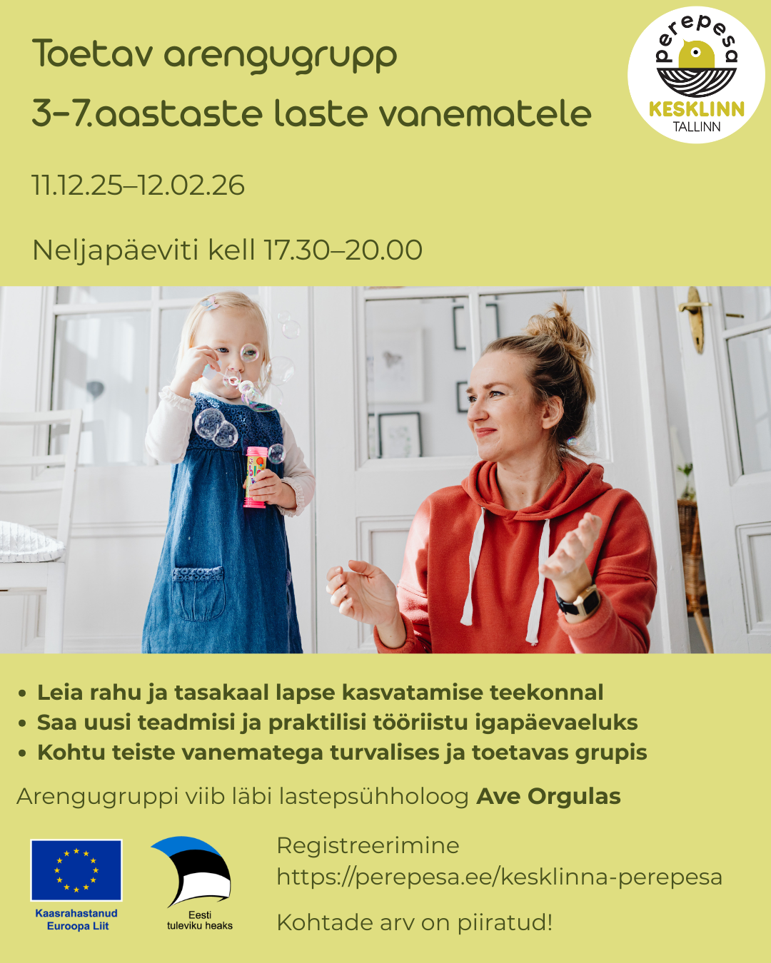 Rohkem infot leiad siit- https://perepesa.ee/kesklinna-perepesa/teenused/toetav-arengugrupp-3-7a-laste-vanematele