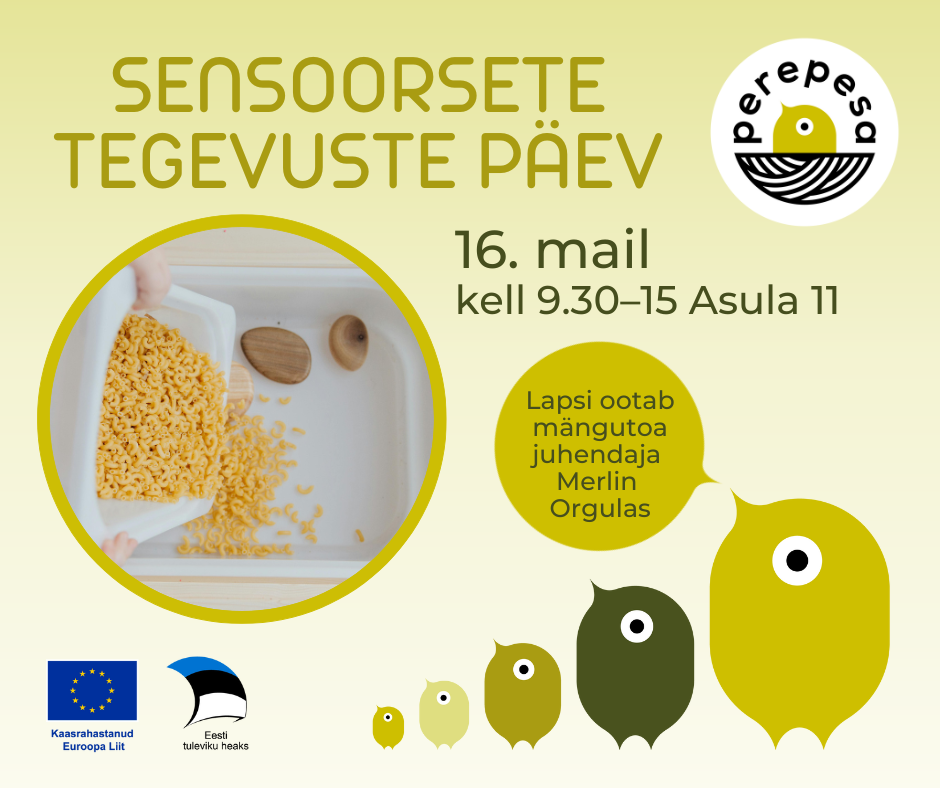 Ootame taas Tallinna peresid, kus kasvavad 0-7 aastased lapsed, Kesklinna Perepessa sensoorsete tegevuste päevale! Tegevuskeskused on avatud mängutoa lahtioleku ajal kell 9.30-15.00.