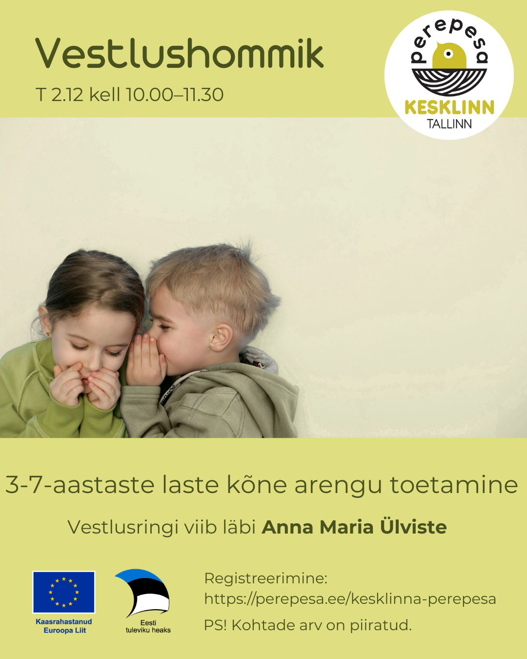Seekordsel vestlushommikul keskendume teemale „3–7-aastaste laste kõne arengu toetamine“. Räägime, millised oskused selles vanuses kujunevad, kuidas märgata võimalikke takistusi ning milliseid praktilisi võtteid saab lapsevanem igapäevaselt kasutada, et oma lapse kõne arengut toetada.
