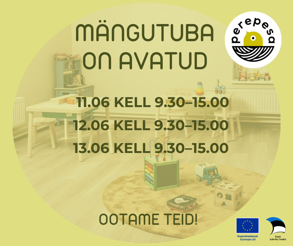 Järgmisel nädalal ootame teid mängutuppa teisipäeval, kolmapäeval ja neljapäeval kell 9.30-15.00. Esmaspäeval oleme suletud.