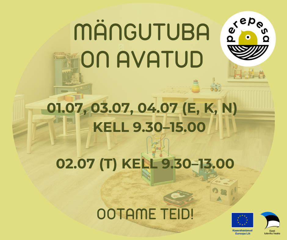 Järgmisel nädalal ootame teid mängutuppa esmaspäeval, kolmapäeval ja neljapäeval kell 9.30-15.00.