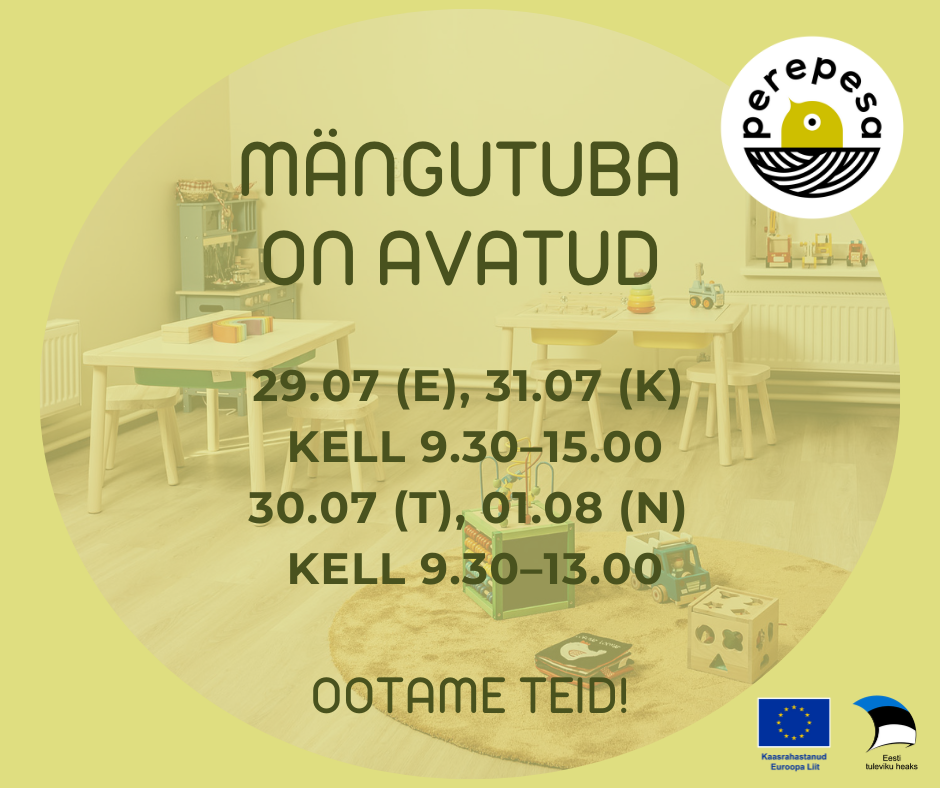 Järgmisel nädalal ootame teid mängutuppa esmaspäeval ja kolmapäeval kell 9.30-15.00. Teisipäeval ja neljapäeval kell 9.30-13.00.