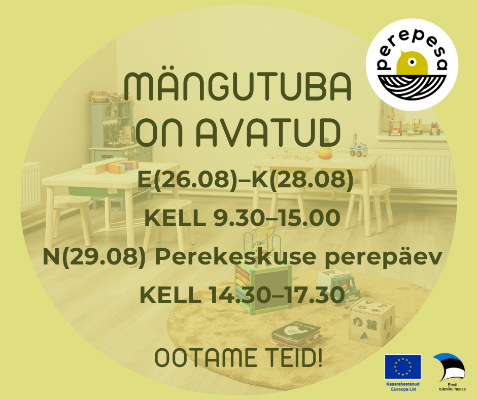 Järgmisel nädalal ootame teid mängutuppa esmaspäeval, teisipäeval ja kolmapäeval kell 9.30-15.00.
