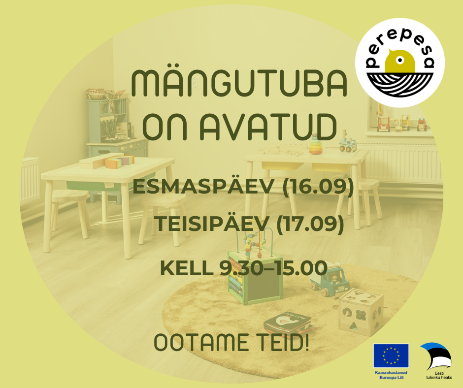 Järgmisel nädalal ootame teid mängutuppa esmaspäeval ja teisipäeval kell 9.30-15.00.