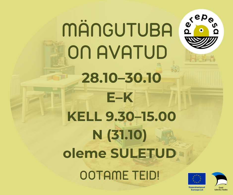 Järgmisel nädalal ootame teid mängutuppa esmaspäeval, teisipäeval ja kolmapäeval kell 9.30-15.00. Esmaspäeva hommikul kell 10-11 ja teisipäeva hommikul kell 10.00-11.30 on avatud mängimiseks ainult väike mängutuba.