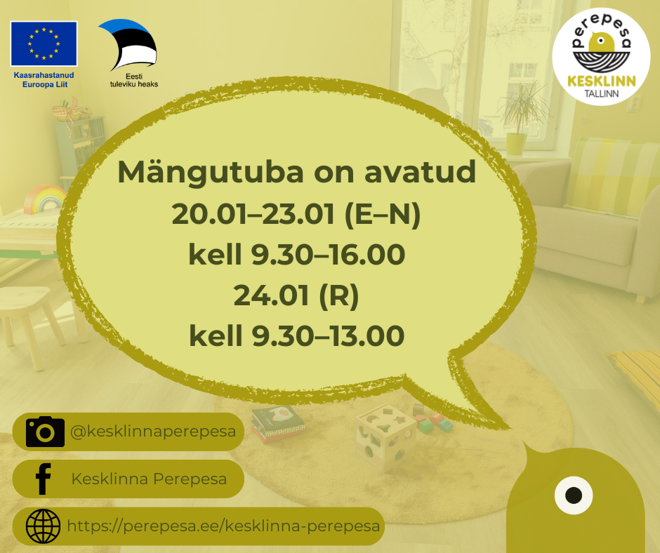 Järgmisel nädalal ootame teid mängutuppa esmaspäevast neljapäevani kell 9.30-16.00 ning reedel kell 9.30-13.00.