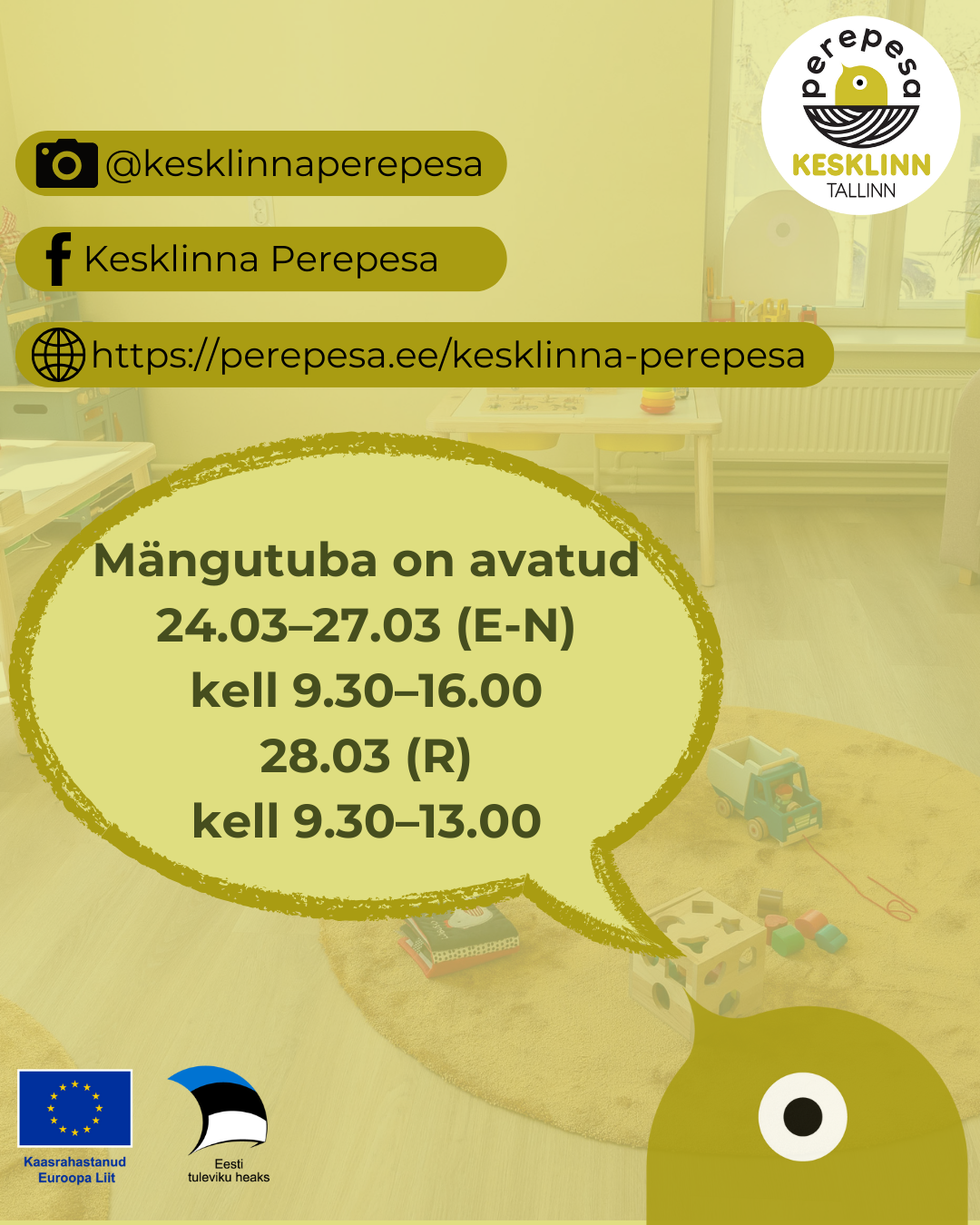 Järgmisel nädalal ootame teid mängutuppa esmaspäevast neljapäevani kell 9.30-16.00 ja reedel kell 9.30-13.00.