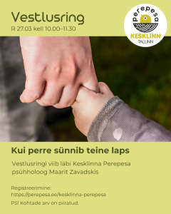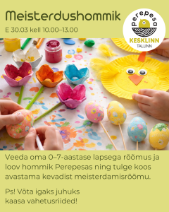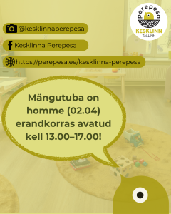 Kesklinna Perepesa lahtiolekuajad 06.04-10.04 02.04 on mängutuba erandkorras avatud kell 13.00–17.00! 30.03 Kevadine meisterdushommik Kesklinna Perepesa lahtiolekuajad 30.03-03.04 27.03 Vestlushommik "Kui perre sünnib teine laps" Kesklinna Perepesa lahtiolekuajad 23.03-27.03 19.03 Robootika töötuba 3–7-aastastele 18.03 Lastekirjanduse hommik Tagasi 2 / 19 lehest (kokku 151 uudist) Edasi