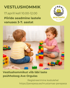 20.04-24.04 Lahtiolekuajad 17.04.26 Vestlushommik - Piiride seadmine lastele vanuses 3-7. aastat 14.04 - 09.06 2-aastase lapse kõne ja arengu toetamine, esimene kohtumine 14.04.26 Liikumise hommik 13.04 - 17.04 Lahtiolekuajad 06.04 - 10.04 Lahtiolekuajad 30.03 - 03.04 Lahtiolekuajad 23.03 - 27.03 Lahtiolekuajad 1 / 2 lehest (kokku 14 uudist) Edasi