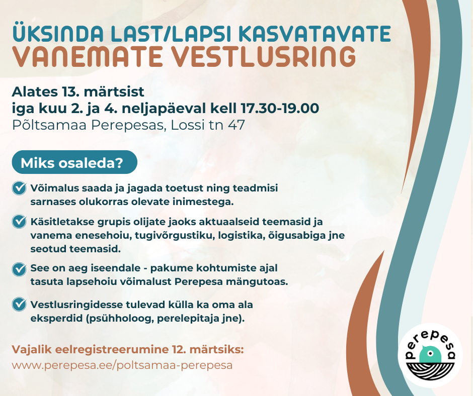 Ootame Sind, kes Sa oma last/lapsi üksinda kasvatad, vanemate vestlusring iga kuu 2. ja 4. neljapäeval kell 17.30-19.00 Põltsamaa Perepessa.