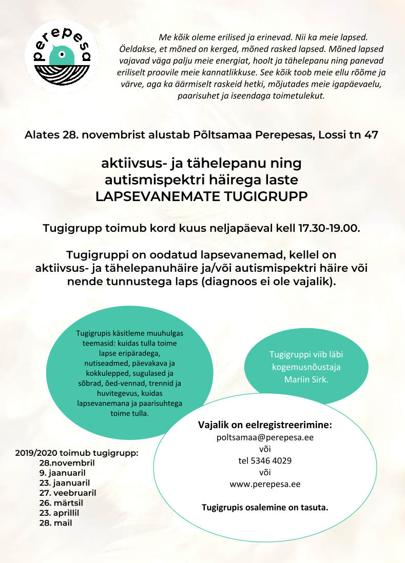 Alustab aktiivsus- ja tähelepanu ning autismispektri häirega laste lapsevanemate tugigrupp 21.11.2019