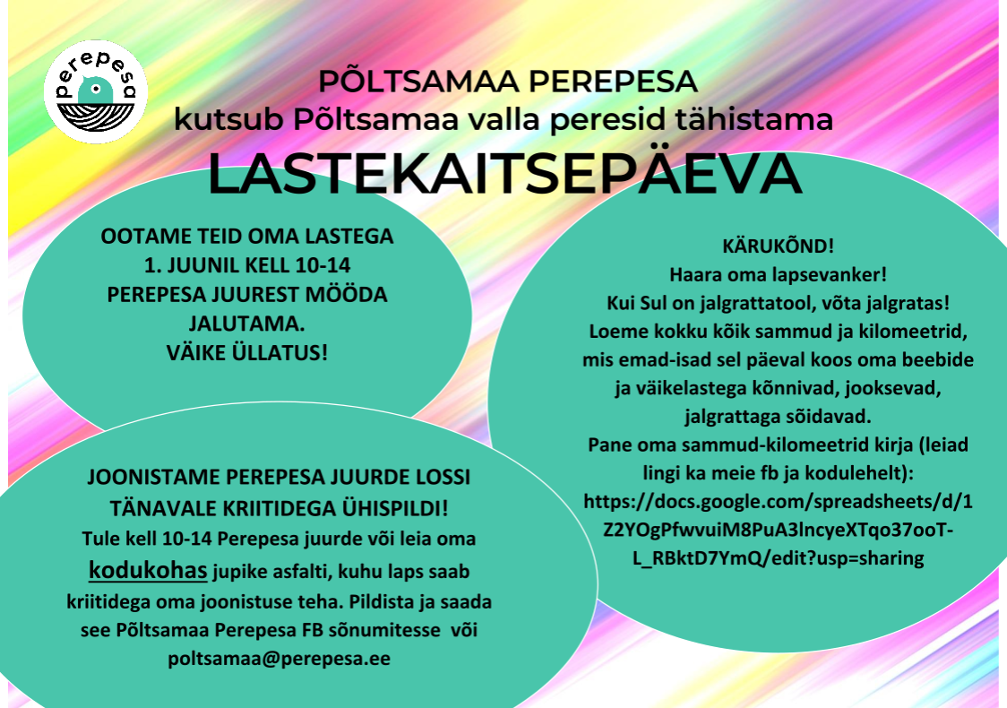 Tule kell 10-14 Perepesa juurde või leia oma kodukohas jupike asfalti, kuhu laps saab kriitidega oma joonistuse teha. Pildista ja saada see Põltsamaa Perepesa FB sõnumitesse või poltsamaa@perepesa.ee