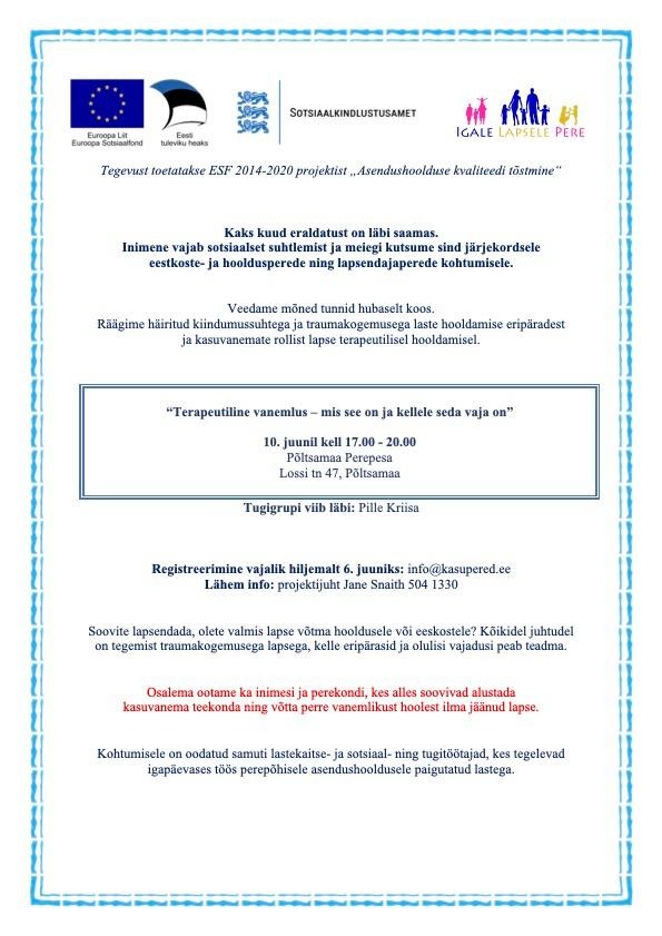 Eestkoste- ja hooldusperede ning lapsendajaperede kohtumine kolmapäeval, 10. juunil kell 17-20