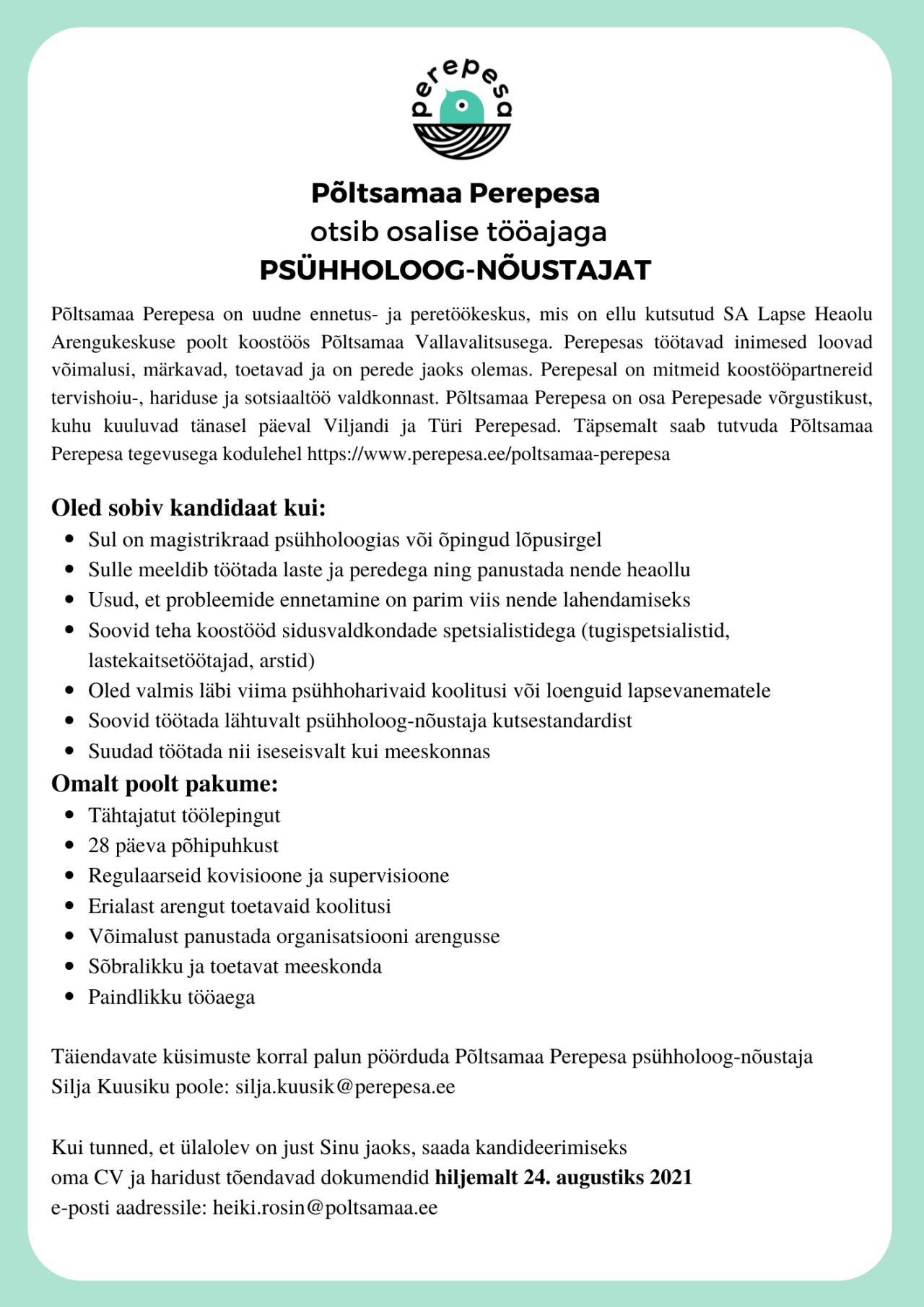 Põltsamaa Perepesa ootab oma meeskonda psühholoog-nõustajat