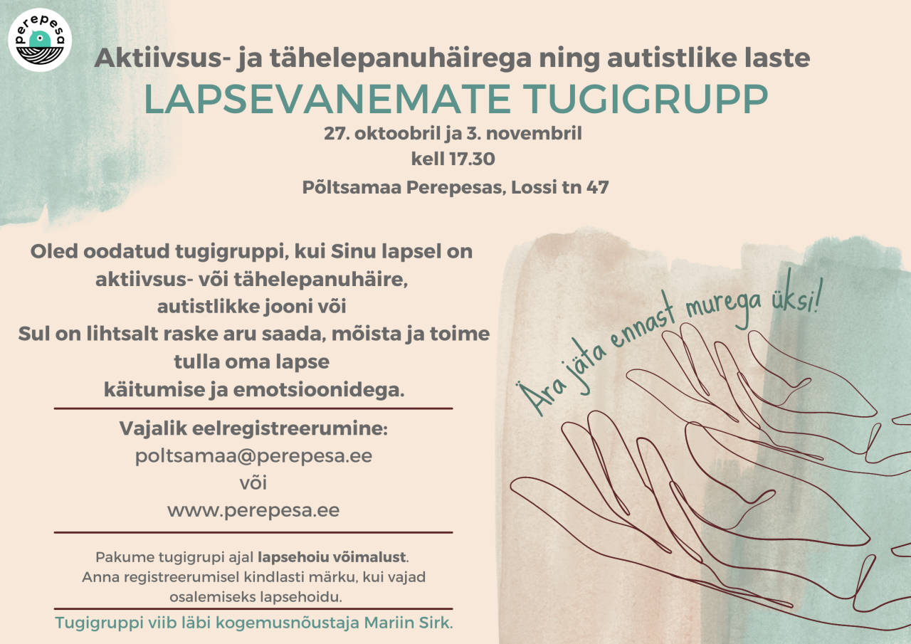 27. oktoobril ja 3. novembril kell 17.30 toimub Perepesas (Lossi tn 47) lapsevanemate tugigrupp.